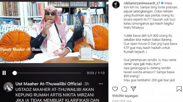 "Kepada saudari Nikita Mirzani yang telah menghina, menyudutkan dan merendahkan imam besar kami Habib Rizieq Shihab dengan sebutan tukang obat, tidak layak seorang muslim dan muslimah yang mengaku beriman kepada Allah dan Rasulnya menghina ulama," kata Ustaz Maaher At-Thuwailibi.